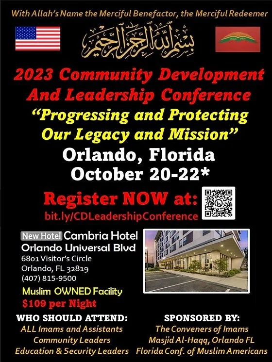 A flyer advertising the 2023 Community Development And Leadership Conference sponsored by the Conveners of Imams. The flyer extends and open invitation to various persons in the Community of Imam W. Deen Mohammed.