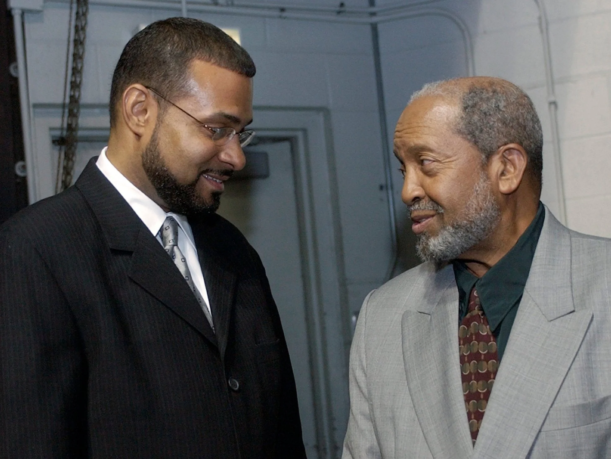 Photo by Stephen J Carrera/AP/Shutterstock (7095055a)—Imam W. Deen Mohammed, right, and Imam Earl Abdulmalik Mohammed, left, talk after a meeting of the American Society of Muslims, in Chicago where it was announced that Imam W. Deen Mohammed resigned as leader of the ASM.